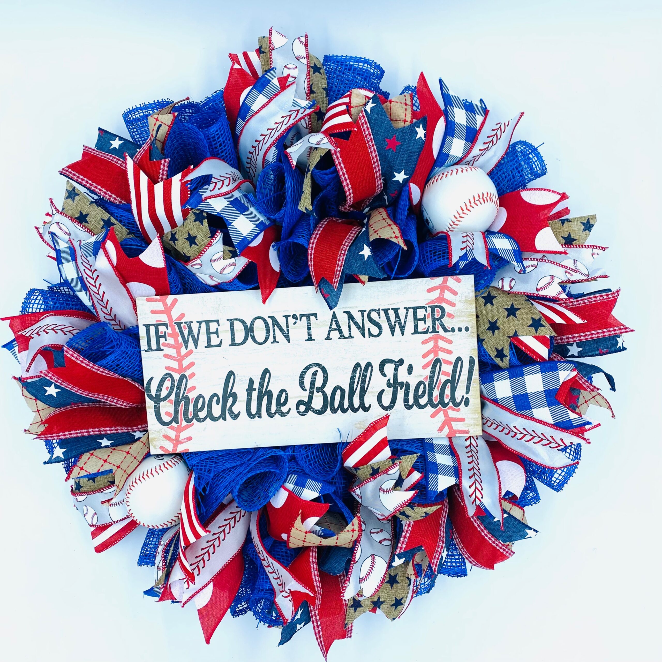 Baseball season is in the air! Show your spirit with this full blue mesh wreath accented with red, white & blue ribbon, wooden sign and real baseballs! Wreath measures 24 inches in diameter. Recommend to shield from direct prolonged sun and rain to maintain the beauty of the wreath for years to come.