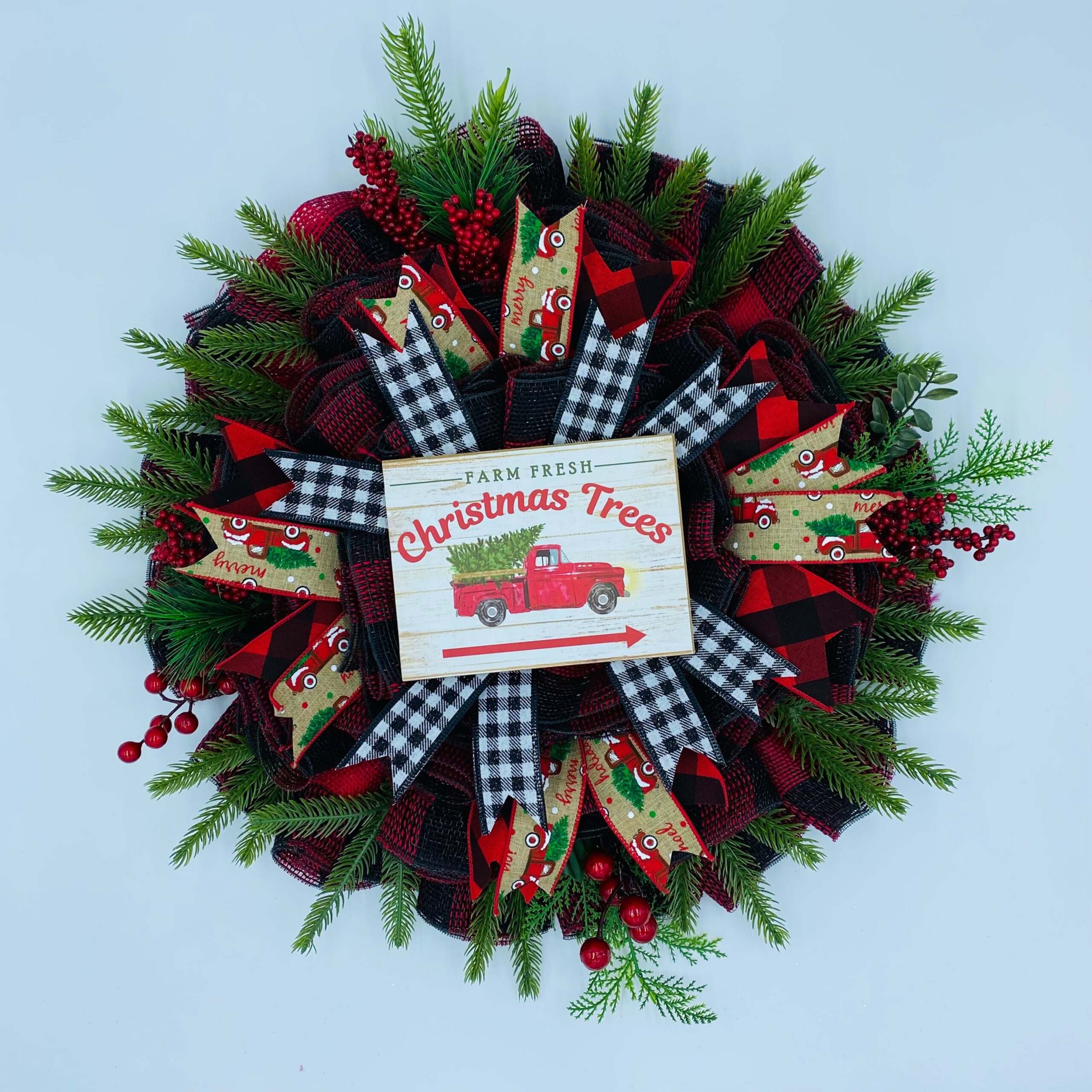 Buffalo red/black plaid mesh wreath with faux evergreens & accent ribbons. Measures 22 inches wide. Sign is made of pressed wood. Recommend to be displayed in a covered area to retain its beauty for years to come. Wreath is available for pickup and local delivery.