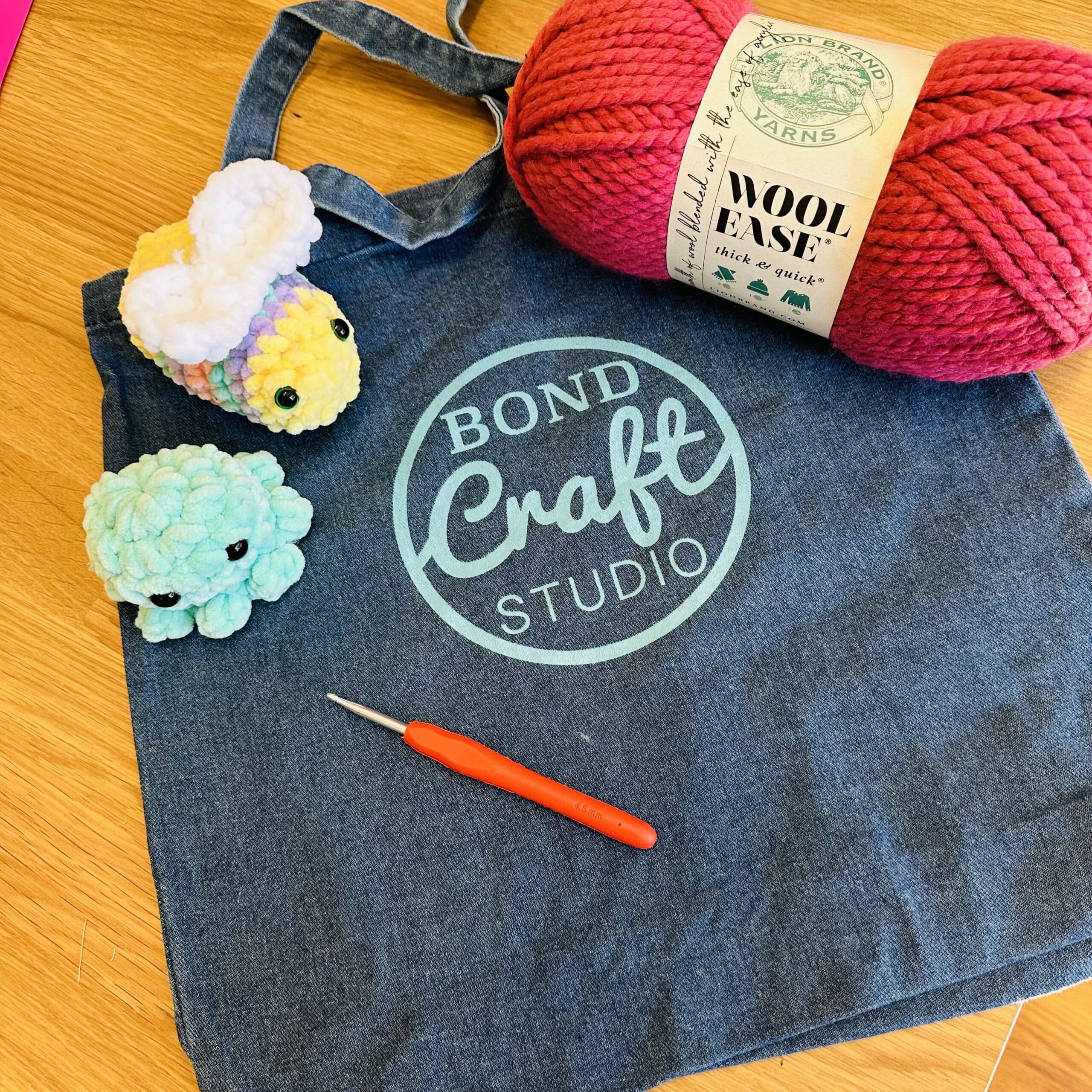 All supplies are provided, including: a set of crochet hooks to keep & a Bond Craft Studio logo bag.
