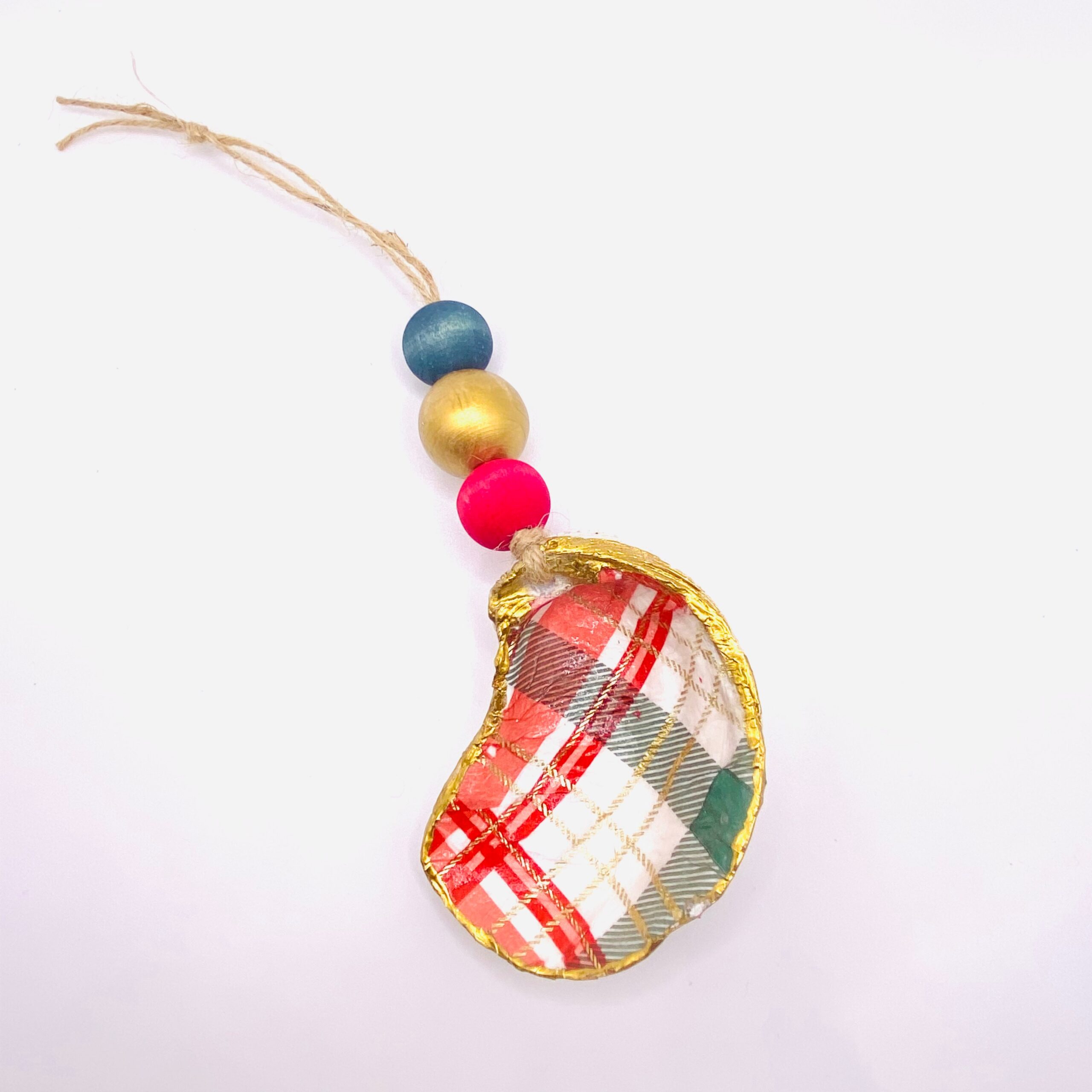 Decoupage oyster shell from the Long Island Sound, with gold trim. Hand painted wooden beads and jute rope. Ornament measures approximately 8” long.