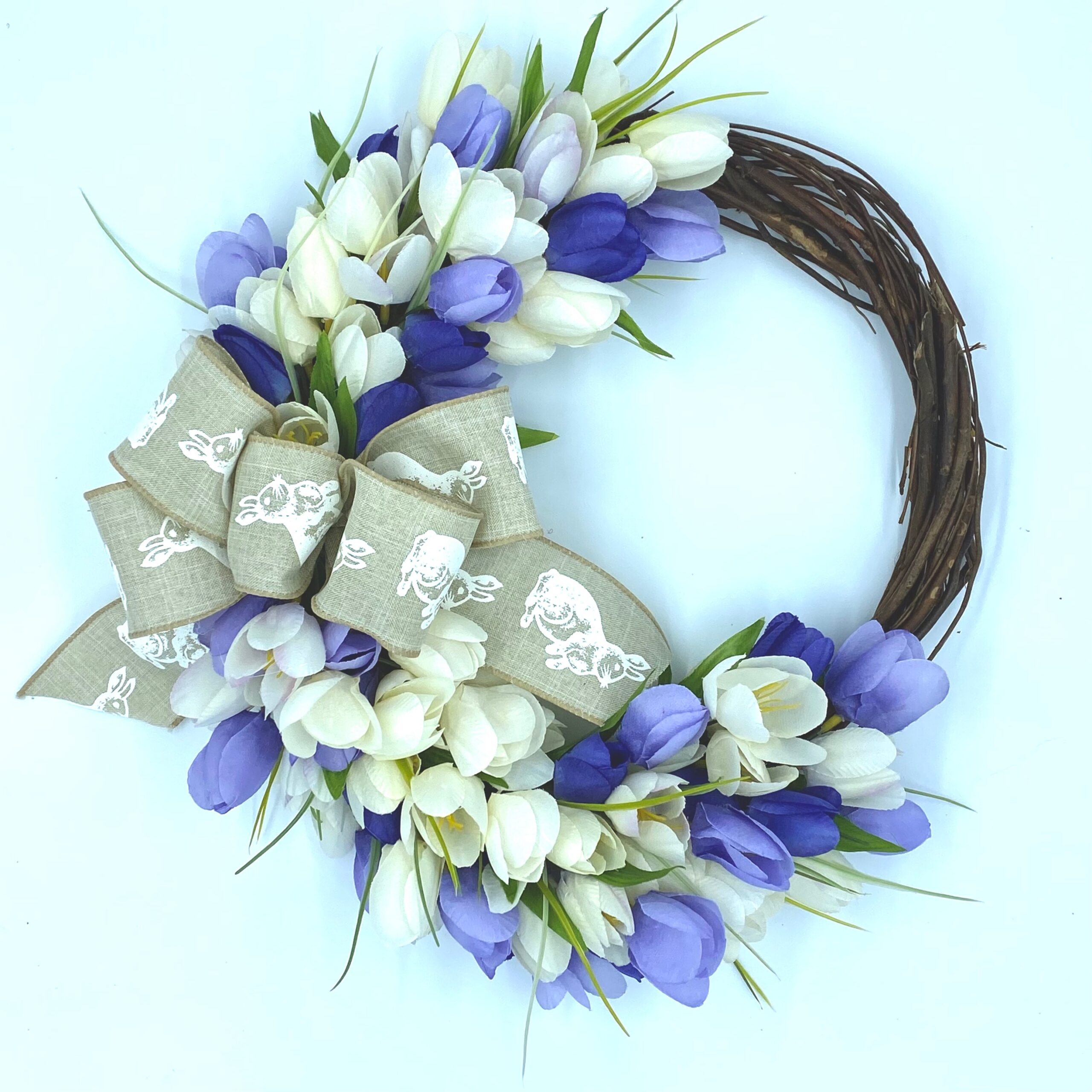 Beautiful tulip grapevine wreath just in time for Easter. Wreath measures 15 inches in diameter, great for a window or smaller door. Purple and cream artificial tulip flowers and a natural wired bow with a bunny design. Recommend to keep out of rain and direct sun to preserve the beauty of the wreath for years to come.