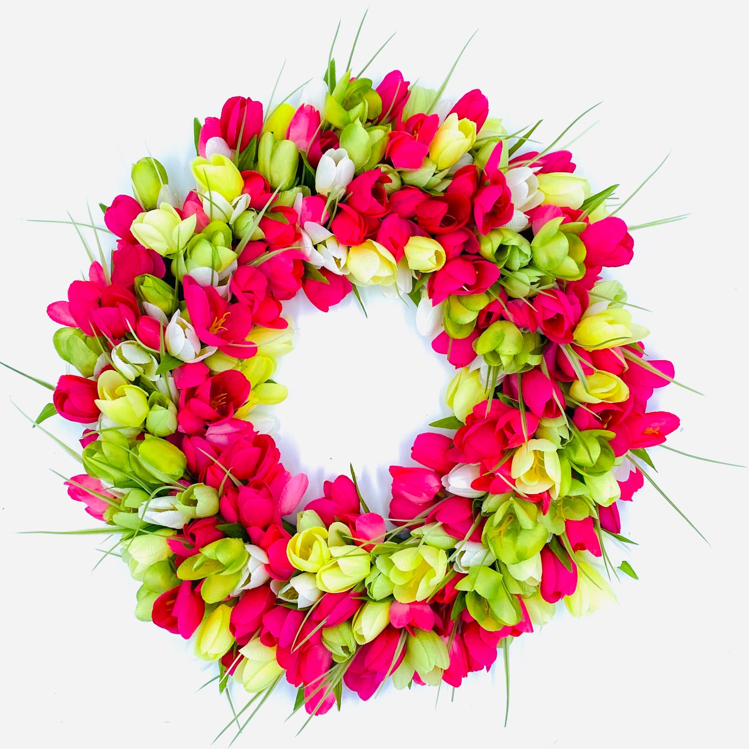 Spring has sprung! Display this beautiful wreath indoors or outdoors packed with yellow and purple artificial tulips. Wreath measures 20 inches in diameter. Recommend to keep out of direct rain and sunlight to prolong the beauty of the wreath for years to come.